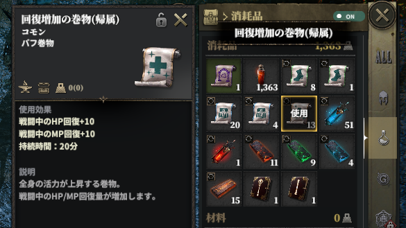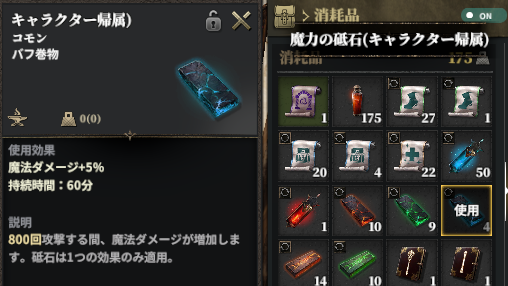 バフを使用し、キャラクタ―を強化するのも有効です。攻撃速度をUPする巻物、火力を上げる砥石、油などのバフアイテムがあるので、必要に応じて活用しましょう。なお、砥石、油の効果はそれぞれ1つのみ適用となるので、適応されるバフの効果についても確認して使いましょう。