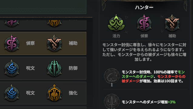 ハンターはモンスター討伐でのダメージ増加効果などもあり、モンスター狩りに適性のある職業ですが、同時に被ダメージも増加します。使用する際は、デメリットがある点を把握して耐久には気を配りましょう。