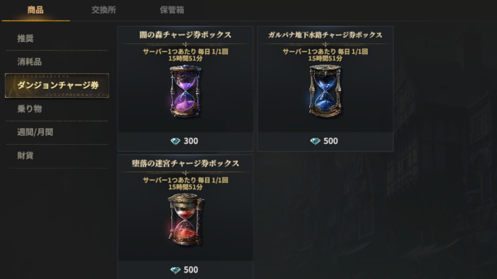 ショップでは、各ダンジョンのチャージ券をダイヤで購入可能です。ただ、ダイヤは他にも使い道の多いアイテムなので、計画的に購入を検討しましょう。なお、チャージ券は毎日購入数に上限のある商品なので、購入検討の際は把握しておきましょう。