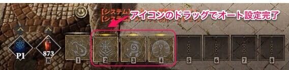 ダンジョン内で放置狩りをする場合は、スキルのオート使用設定をしましょう。画面下の対象のスキルアイコンをタップして下にドラッグすると、スキルのオート設定が可能です。スキルの連続使用でMP切れになる場合は、設定の調整も検討しましょう。
