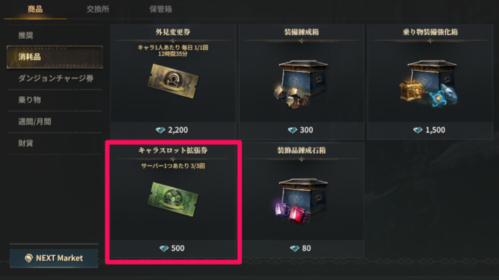 3キャラ目以降の作成にはキャラスロット拡張券が必要です。ショップ>消耗品から500ダイヤで購入できます。なお、購入はサーバー1つあたり3個までで、最大5キャラの作成が可能です。