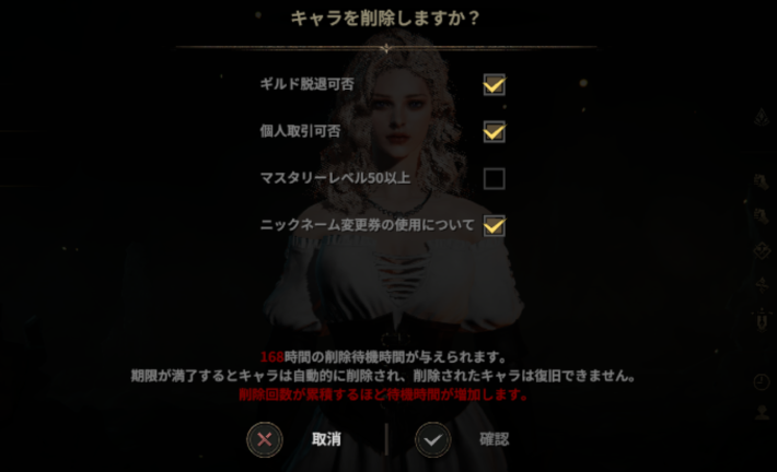 キャラクターの削除はキャラクター選択画面左下の「キャラ削除」から行えます。削除するには「ギルド脱退可否」「個人取引可否」「マスタリーレベル50以上」「ニックネーム変更券の使用について」の4項目にチェックが入っている必要があります。