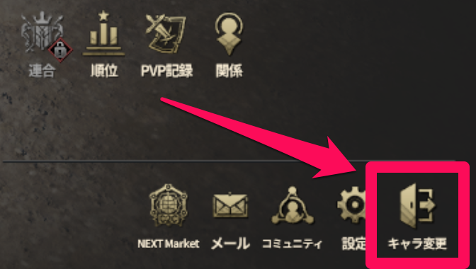 プレイ中にキャラを変更したい場合は、メニュー画面右下の「キャラ変更」からキャラクター選択画面に移動することもできます。なお、戦闘中は使えない点に注意しましょう。