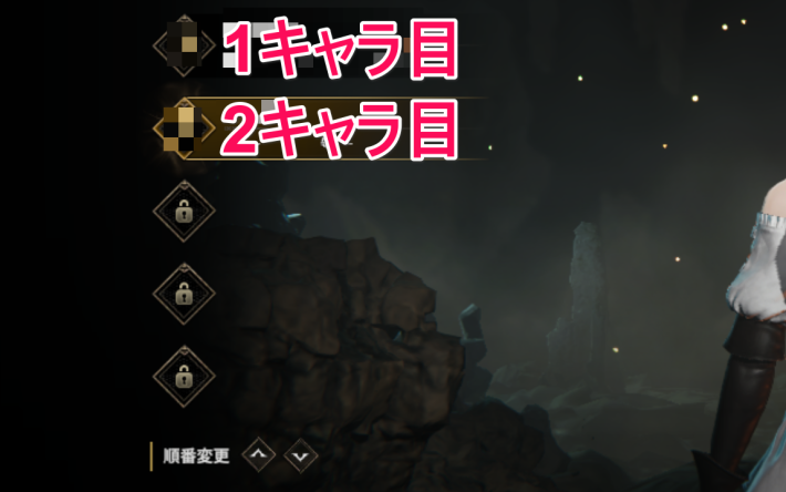 サブキャラを作成すると、1キャラ目の下に2キャラ目が表示されます。使いたいキャラを選択してSTARTを押しましょう。なお、下部の順番変更でキャラの順番の入れ替えが可能です。