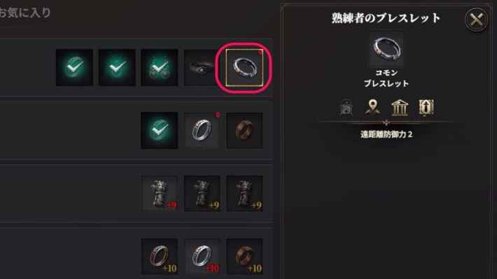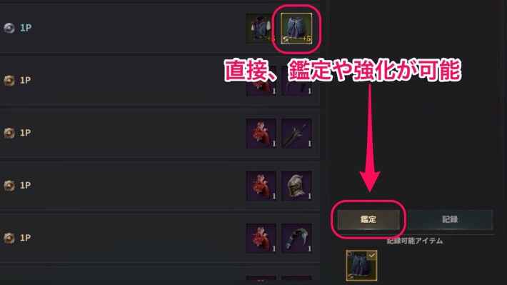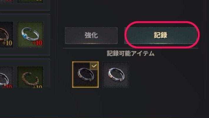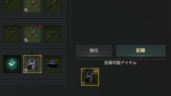 強化することで記録可能なアイテムがあると、アイテムアイコンが明るく表示されています。その場合は、アイテムをタップし、「鑑定」や「強化」を選択して直接強化してから記録することも可能です。