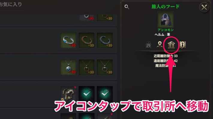 アイテム画面の取引所アイコンをタップすることで、対象アイテムの取引画面への移動も可能です。