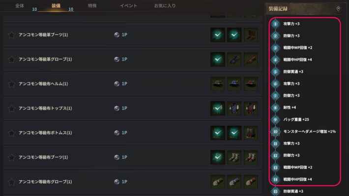 アイテム履歴を記録すると、様々なステータスを獲得可能です。攻撃力やダメージ増加などのほか、戦闘中のMP&HP回復UPも可能と、戦闘に有利な効果を獲得できます。