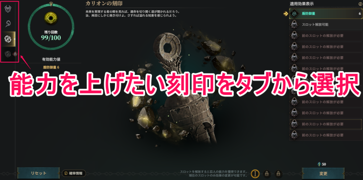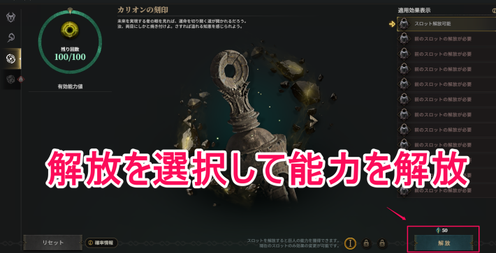 各刻印は「1~3、5~7、9~11」スロットと、「4、8、12」スロットで、解放できる能力値が異なります。 また、適用効果表示を選択することで出現効果の詳細を確認することができます。 事前に、各スロットで有効化できる能力値を調べてから、解放することをおすすめします。