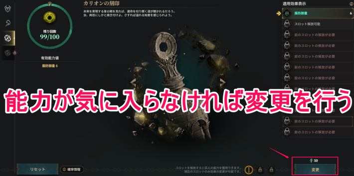 解放した能力が気に入らなければ変更を選択して気に入る能力が出るまで変更を繰り返しましょう。また能力は時の欠片の所持数に関わらず、各刻印100回までしか変更できない点に注意しましょう。