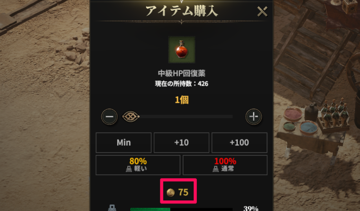 ゴールドは雑貨屋でポーションなどを購入するために使用します。狩り場の難易度を上げるたびに消費するポーションの量は上がるのでゴールドの主な使用先になります。