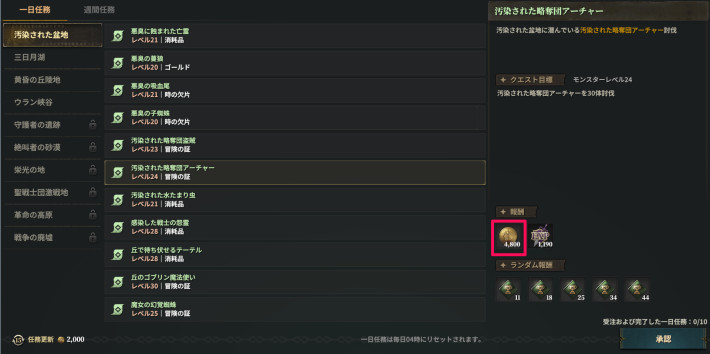 ゴールドは1日任務を行うことで入手が可能です。ただし1日に受けられる1日任務の数には限りがあり、受け取れるゴールドの数にも限りがあることに注意が必要です。