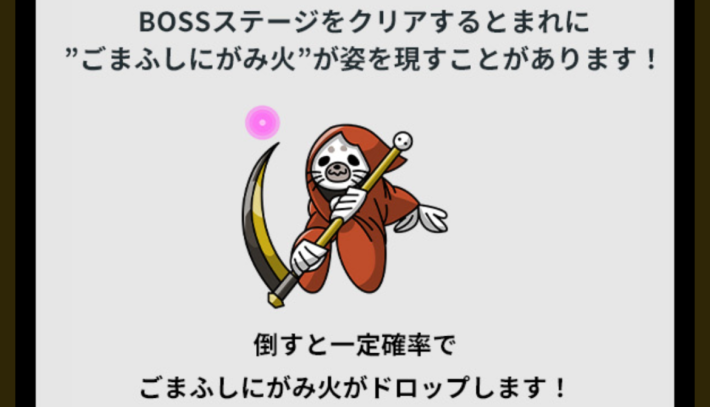 BOSSステージクリア時には、まれにごまふしにがみ火が出現する場合があります。倒すと一定確率で、ごまふしにがみ火がドロップします。