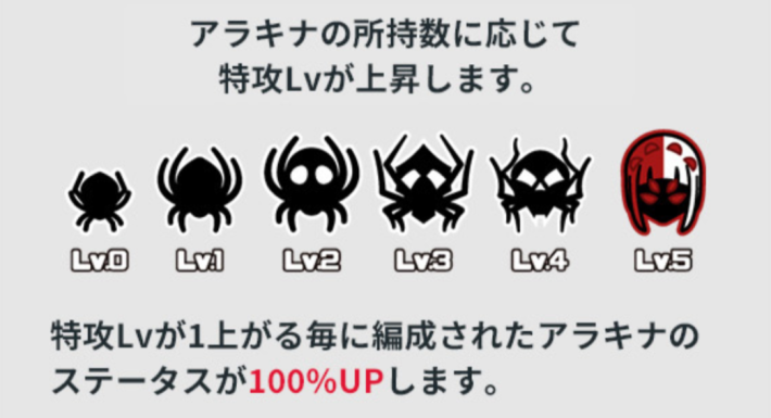 特攻レベルを上げることで、パーティーに編成したアラキナのステータスを大幅に上げることができます。特攻レベルが1上がるごとに+100%上昇し、5の倍数の時には+500%が上昇するので、特攻レベルを上げてアラキナのステータスを強化しましょう。