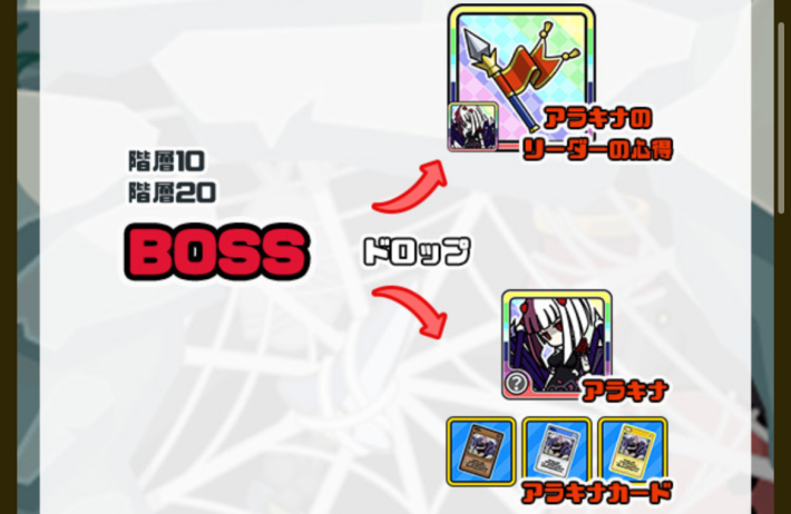 10階層と20階層のボスは、低確率でアラキナやアラキナカードがドロップします。このドロップ率は、限定商品を購入することで上昇可能です。