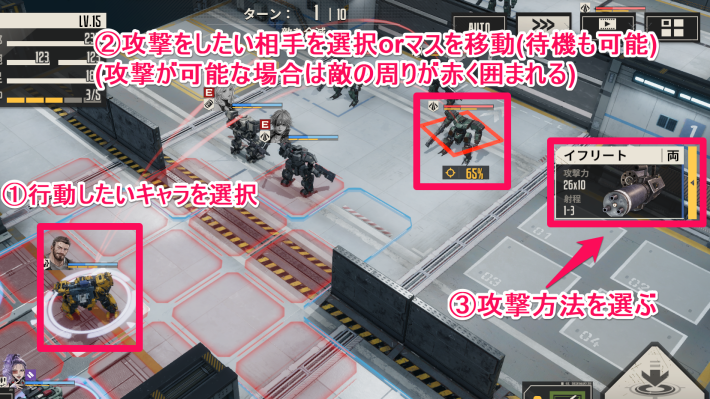 | Tips! | 自分のターンは好きな順番でキャラを行動させることができます。 |