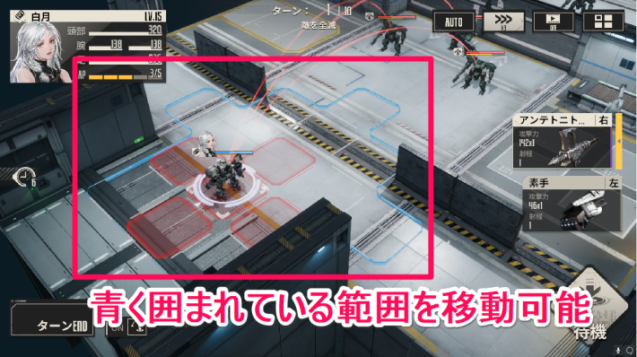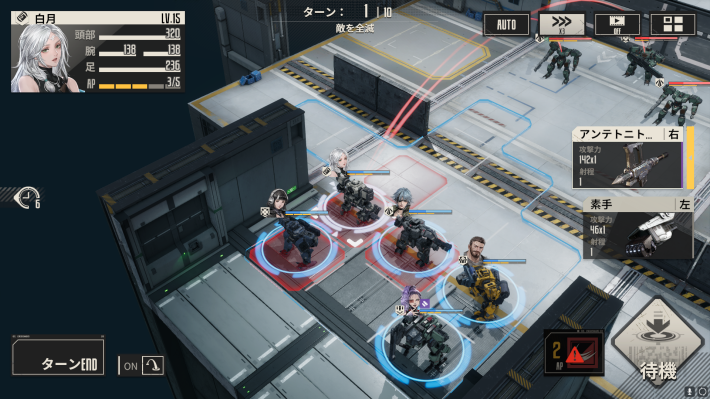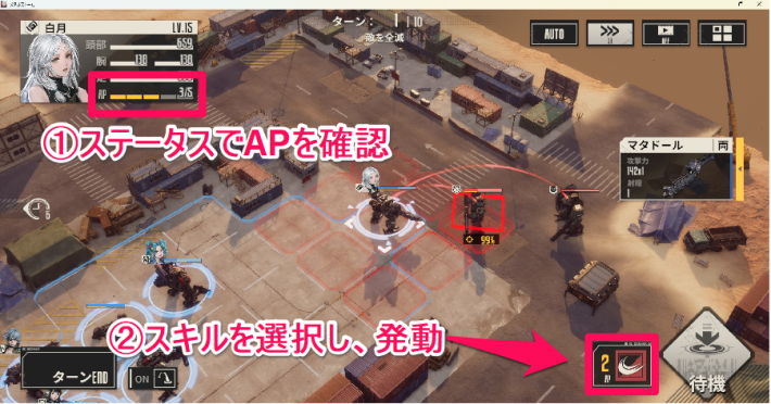 APを使って操縦士のスキルを発動したり、武器で攻撃することになります。APはターン開始時に一定量回復し、回復量はキャラ(操縦士)毎に変わります。