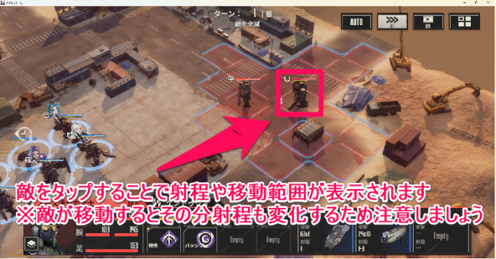 敵の射程や移動範囲を確認したい場合は、敵のキャラをタップすることで確認できます。赤い枠は射程距離、青い線で囲まれまているのが移動範囲です。射程距離は敵の立ち位置によって変わるため注意しましょう。