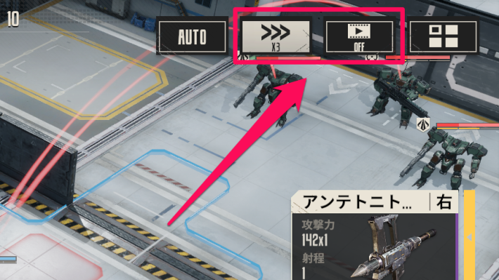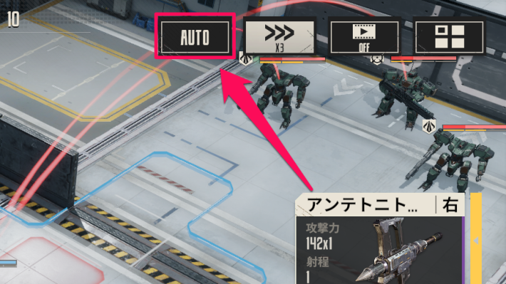 画面左上の「AUTO」を選択すると、戦闘を自動で行ってくれます。格下の敵との戦闘などで特に手動操作が不要な場合などに利用すると良いでしょう。