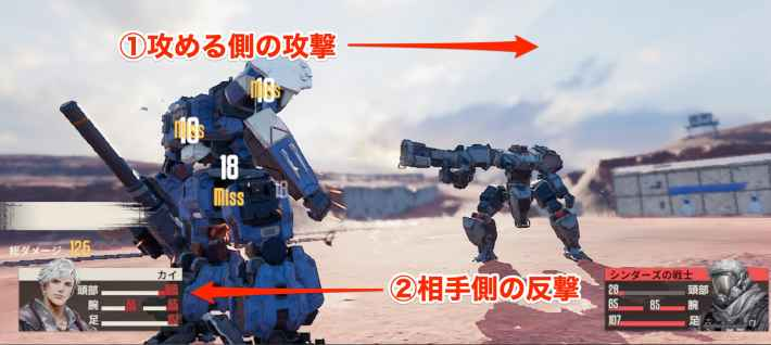 戦闘は基本的に、攻める側が攻撃した後に相手の反撃が発生する仕様となっています。そのため先に攻撃して腕のパーツ破壊を行うことで、敵の反撃ダメージを最小限に抑えるといった動きも可能です。