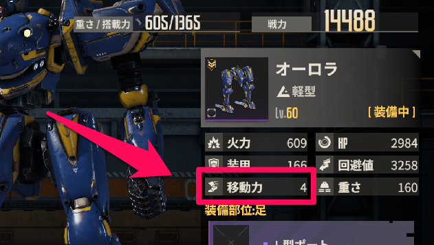 操作するキャラの移動距離は足STパーツの移動力の数値で決まり、戦闘中の機動力に大きく関係します。基本的に中型と重型のSTパーツは移動力は3となり、軽型のSTパーツの移動力は4と高くなっています。