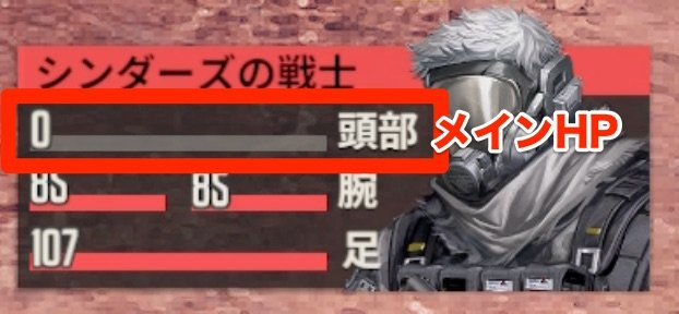 キャラに設定したSTが戦場でのHPとなり、頭部・腕・足の4つのSTパーツにそれぞれ別々にHPが表示されます。その中でも頭部STパーツのHPが操作キャラのメインHPとなっており、頭部のHPが0になると操作キャラが死亡する仕様となっています。