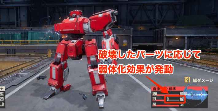 腕・足のSTパーツを破壊することでパーツ破壊による弱体化効果を与えることが可能です。腕を壊すと腕と肩に持つ武器の使用ができなくなり、足を壊すと敵の移動力を1マスに制限するなど、先にパーツを破壊することで戦闘を有利に進められるようになります。