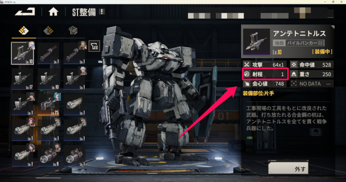 腕武器を装備させるとキャラの攻撃方法が変化します。武器が持つ射程範囲内で攻撃や反撃が可能になるため、装備する腕武器によって戦い方が大きく変わります。
