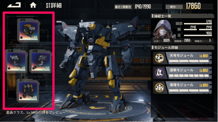 STは、頭部/右腕/左腕/足の4部位のSTパーツで構成されます。4つのパーツ1つ1つに別のステータスが存在し、STの体力や攻撃力、移動力などに関係します。