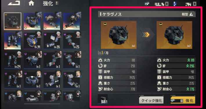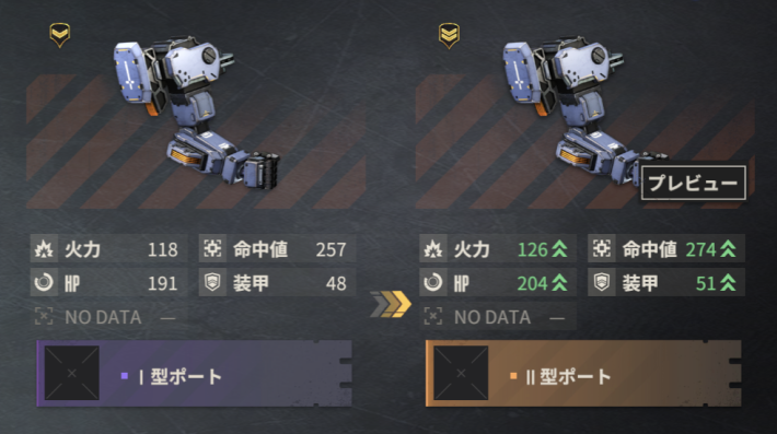 | クラスアップ | 同名同部位パーツや同クラスのパーツを素材にして、パーツのクラスアップが可能。クラスが上がると、ステータスが強化されたり、モジュールやモジュールを装備できるポートが解放される。 |