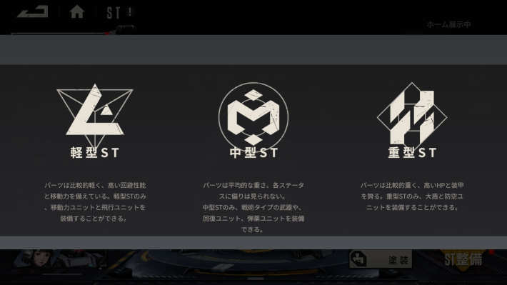 中型STは耐久力と火力ステータスが共にバランスのとれた機体です。また中型STは装備できる重量(搭載力)が一番多く、さらに戦術タイプの武器や回復ユニット、弾薬ユニットなど多種多様な装備が可能です。