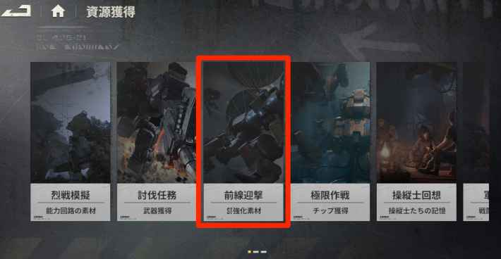レベルアップ素材となる強化部品は、資源獲得ステージの「前線迎撃」で効率よく入手することができます。