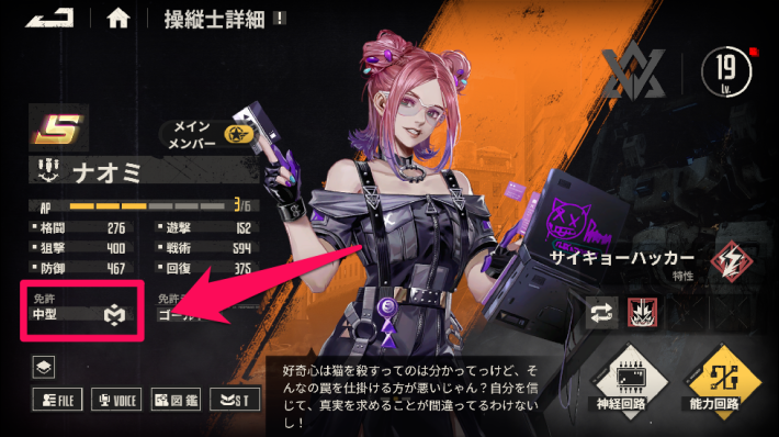操縦士の免許はキャラ画面左下から確認できます。