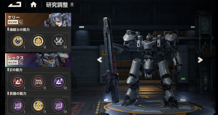 | 研究 | 研究によって開放された能力ポートに特殊能力を装着可能。操縦士/ST/武器のそれぞれのポートに能力を装着できる。 |