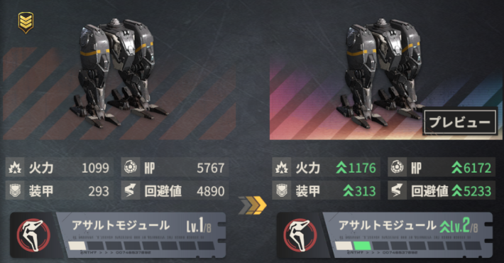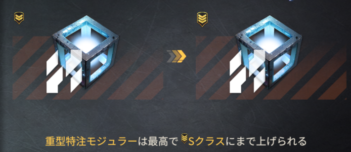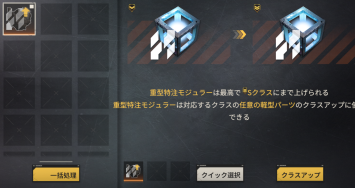 汎用モジュラーと特注モジュラー「金Ⅰ」の2種類がアイテムとして存在し、2つを使用してモジュラーのクラスを強化していくことになります。クラス強化を行った特注モジュラーはを行うと、STパーツの上位クラスアップに使用できます。