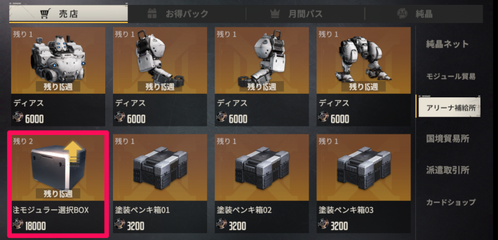 特注モジュラーは、売店のアリーナ補給所から入手可能です。アリーナのプレイで獲得できるドールコインを貯めて、優先的に交換するのがおすすめです。