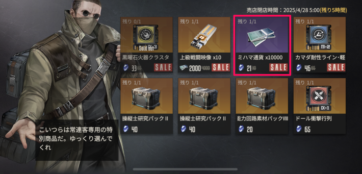不定期に出現する謎の商人では、購入可能なアイテムの中にミハマ通貨がラインナップされていることがあります。セールになっていれば通常の購入よりも少ない純晶で購入することができますが、純晶を使っての購入はコスパが悪いためあまりおすすめしません。