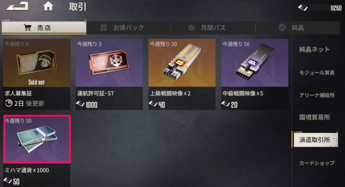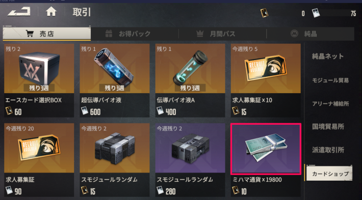 売店の派遣取引所やカードショップでミハマ通貨を購入することもできます。ただし、求人募集証などのガチャ素材も購入可能なため、ミハマ通貨が急ぎで必要な場合にのみ利用するのがおすすめです。
