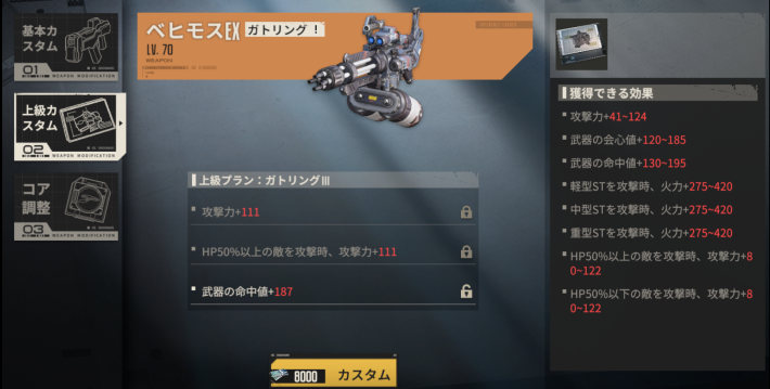 武器の性能を強化する「カスタム」でミハマ通貨が必要になります。上級カスタムでは好みのステータスが獲得できるまで厳選が可能なため、大量のミハマ通貨を準備して理想のステータスを目指しましょう。