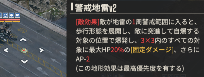 マップ上に複数配置されている警戒地雷は、周囲1マスに侵入すると爆発し、HPの20%のダメージとAPが2減少します。APを使い切ったキャラで地雷を踏むことで、AP減少を回避できます。