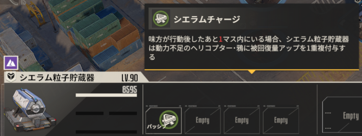 マップ上に配置されているシエラム粒子貯蔵器の1マス以内に味方が待機すると、ヘリコプターの被回復量がアップします。シエラム粒子貯蔵器は時間経過とともにマップ上に出現するため、より多くのシエラムを獲得して回復効率を高めましょう。