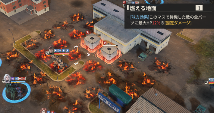 マップ中央には燃える地形が出現し、待機している味方は固定ダメージを受けてしまいます。燃える地形は毎ターン出現するため、地形効果を持つ味方のスキルで上書きして固定ダメージを回避しましょう。
