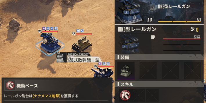 マップ上に配置されているMK3型レールガンは縦横斜め一列に高火力な単体パーツ攻撃を行います。複数の味方が同時に攻撃を受けないように、岩を壁にして味方の配置に気をつけましょう。