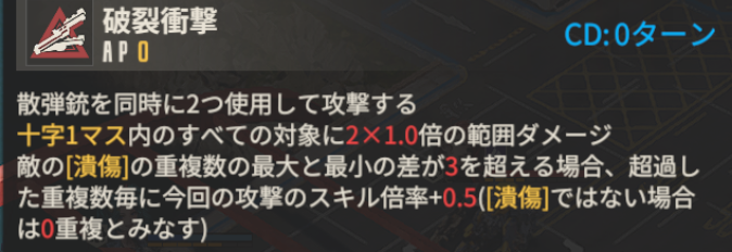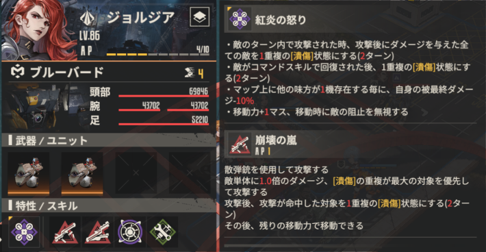 ジョルジア | 【武器】散弾銃 【ST】 ブルーバード ・被攻撃時に潰傷を付与 ・マップ上の味方の数×最終ダメージ-10% ・1ターンで3回以上攻撃を受けると潰傷を付与 |