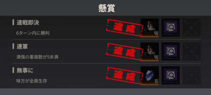 潰傷の重複数が5以上になると実績を獲得できません。重複数が多いキャラでの攻撃は避けたり、ターン内で3回以上ボスに攻撃しないように注意しましょう。