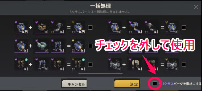 低レアパーツのクラスアップは一括処理を使って行うのが効率的です。ただし、Aクラスパーツを素材にする場合、意図しないパーツまで処理してしまう可能性があるため、一括処理画面でチェックを外して処理しましょう。