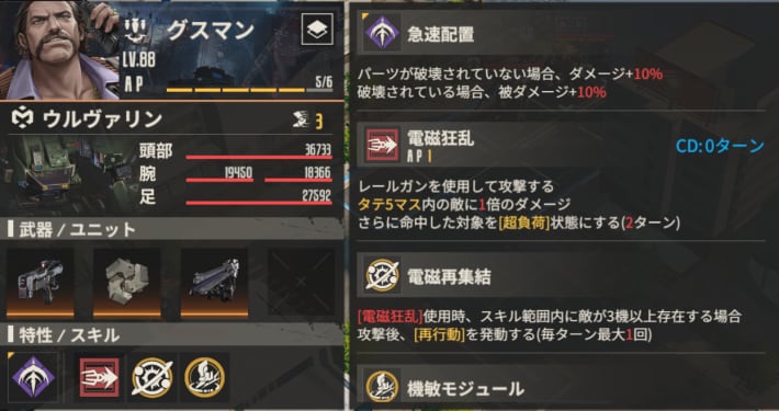 ![]() グスマン | 【武器】レールガン/ガトリング 【ST】ウルヴァリン ・電磁狂乱の範囲に3体以上で再行動 ・超負荷で消費AP+1付与(最大5重複) ・レールガン命中毎に回避+20% |