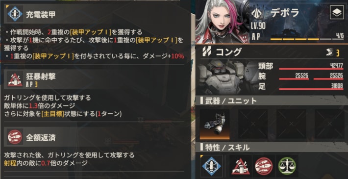 ![]() デボラ | 【武器】ガトリング/ロケット 【ST】コング ・主目標付与→全額返済で被ダメ+100% ・行動開始時に均等で部位HP割合を揃える ・命中毎に装甲アップ蓄積(与ダメ上昇) |
