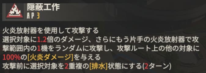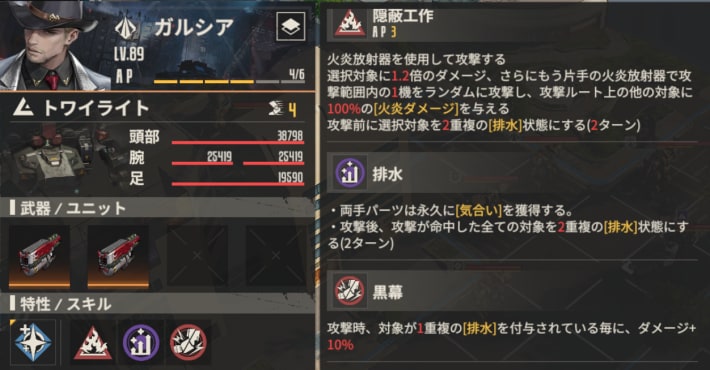 ![]() ガルシア | 【武器】火炎放射器/火炎放射器 【ST】トワイライト ・排水で命中低下(最大10重) ・命中対象へ排水2付与 ・HP減で回避上昇/完全回避で修復 |