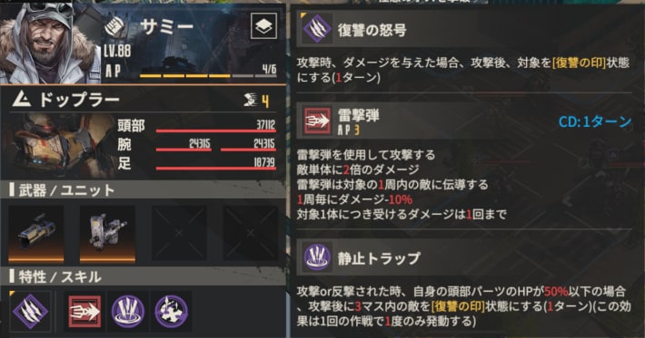 ![]() サミー | 【武器】多機能設置機/パイルバンカー 【ST】ドップラー ・攻撃やHP50%以下で印を付与 ・印で回避率上昇(最大90%) ・雷撃弾が隣接の味方に広がる |