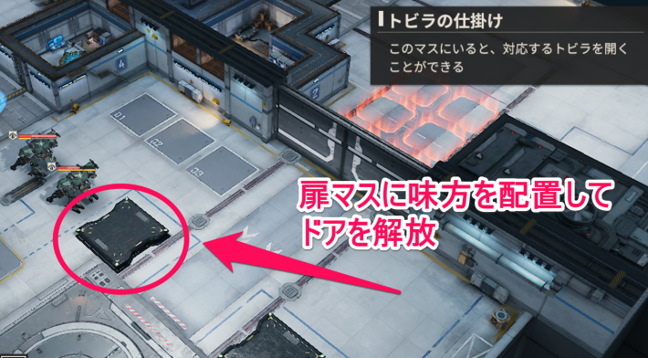 このステージでは、敵マリーを脱出マスまで誘導することでクリアとなります。脱出マスまでは扉が存在し、特定マスへ味方を配置することで扉を開放できます。
